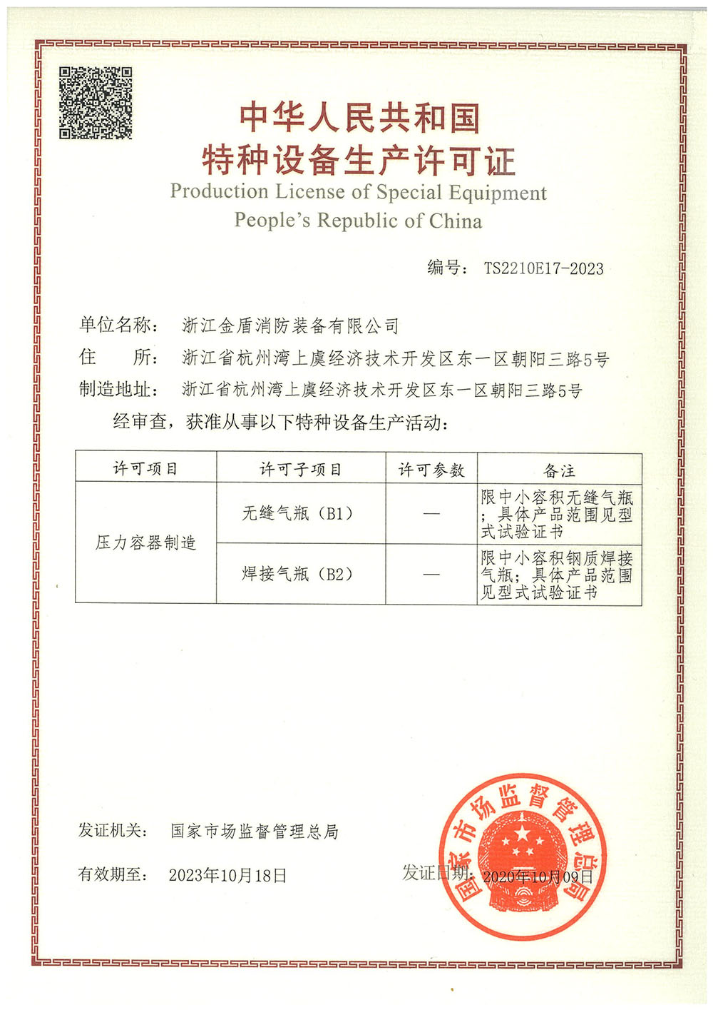 B1 Seamless Steel Cylinder Manufacturing Licence Quality management system certification of weapon equipment